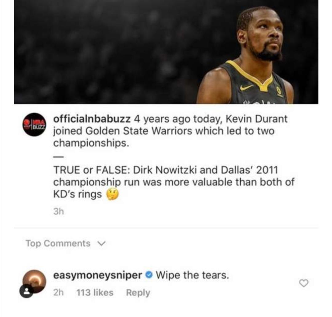结果杜兰特就回复了评论:擦干你的眼泪吧!