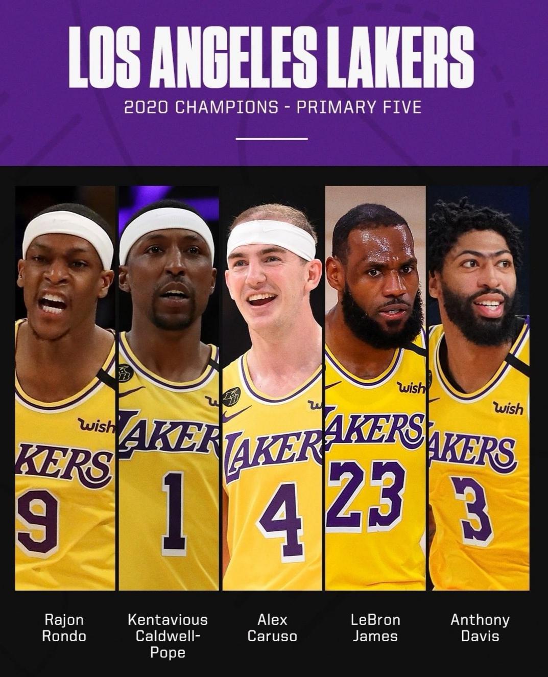 这套首发阵容属于两巨头带三名角色球员(篮球术语中对角色球员Role Player的定义是:除了球队当家球员之外的球员,但又区别于打垃圾时间的龙套球员,可以理解为当家球星的得力助手。)詹姆斯和浓眉的实力毋庸置疑,属于超级球星行列,而配套的隆多,虽然到了生涯末年,但还是凭借高球商担任球场指挥官;波普优秀的3D球员,他在场上担任了第三得分点的角色,詹眉状态不好时,他需要站出来得分;卡鲁索则是以劲爆的扣篮和坚韧的防守获得了一席之地,他的效率一直处于联盟顶尖,虽然不是巨星,但他把自己应履行的职责做到了极致。