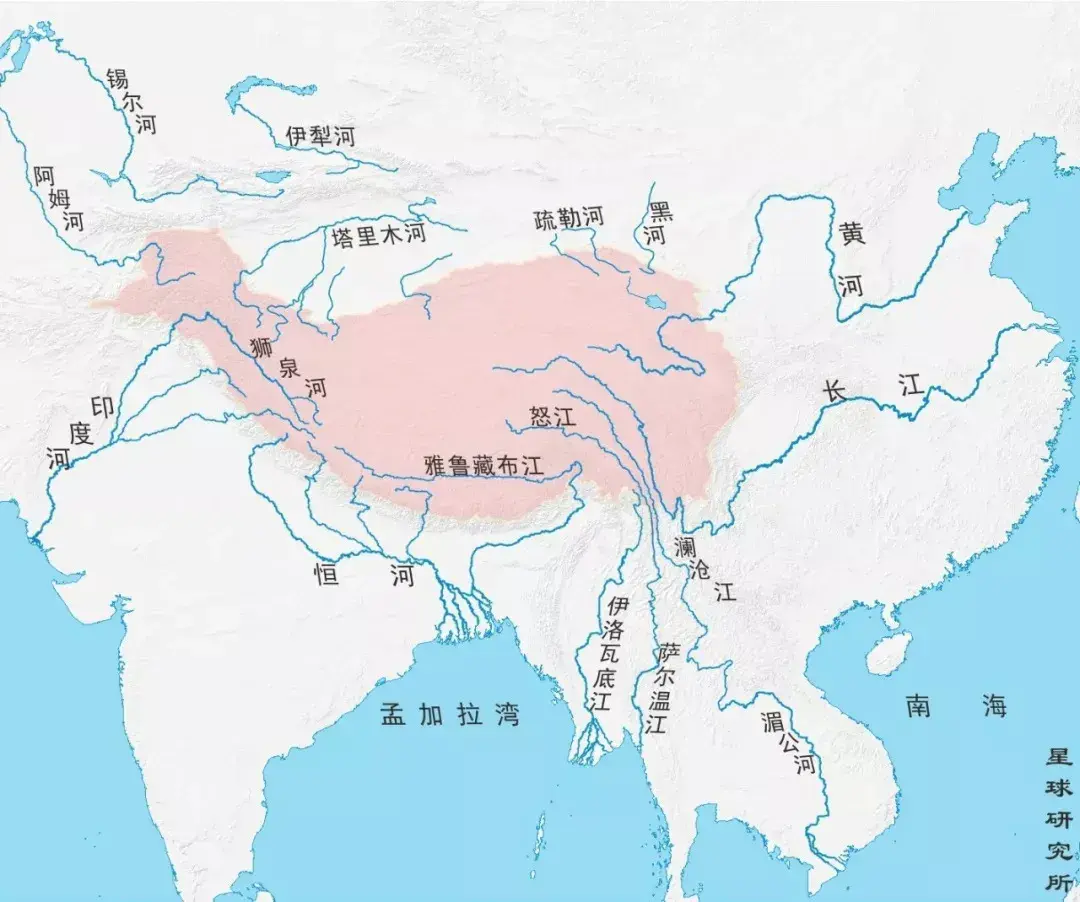 图46,青藏高原及其周围水系流向分布图。