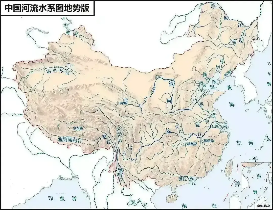 图20,中国地势图。青藏高原是许多大江大河的源头,中国的两条母亲河黄河水系和长江水系源头都是在青藏高原上。