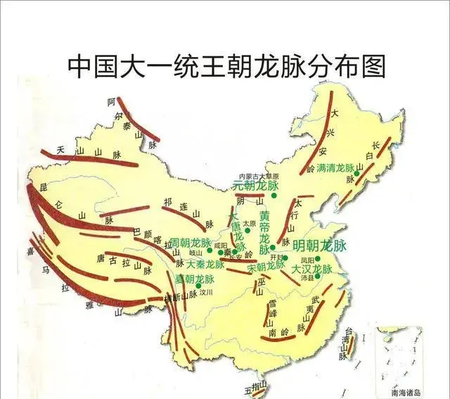 图10,中国的山脉简图、各大一统王朝龙脉分布图。