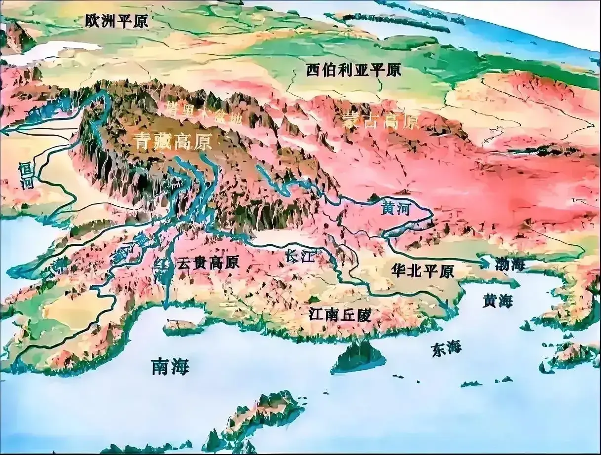 图18,东亚、北亚、东南亚、欧洲平原地势和主要水系彩绘图。思考一下青藏高原的重要性。