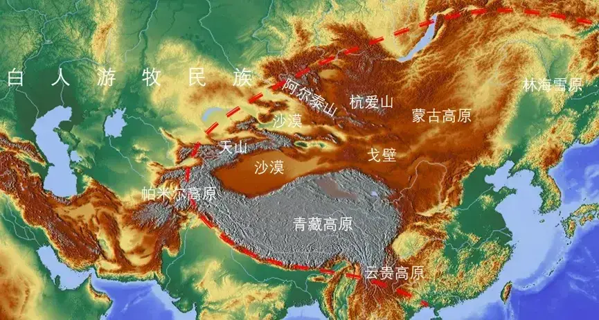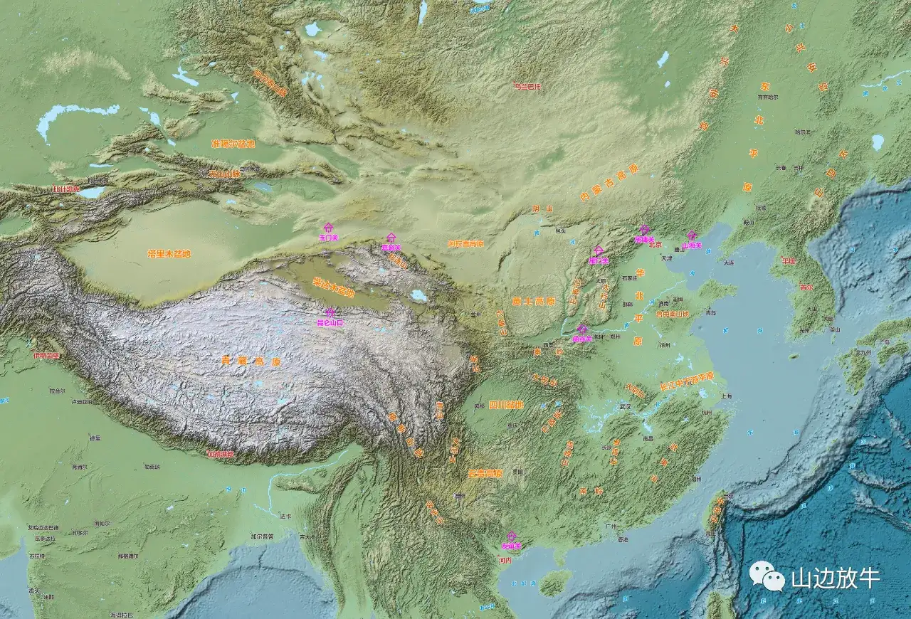 图1,亚洲东部地形图,我国最好的疆界应该是以山脉为国界线(越南山脉、横断山脉、喜马拉雅山脉、天山山脉西麓、阿尔泰山脉、唐鲁乌梁海、贝加尔湖、外兴安岭)。