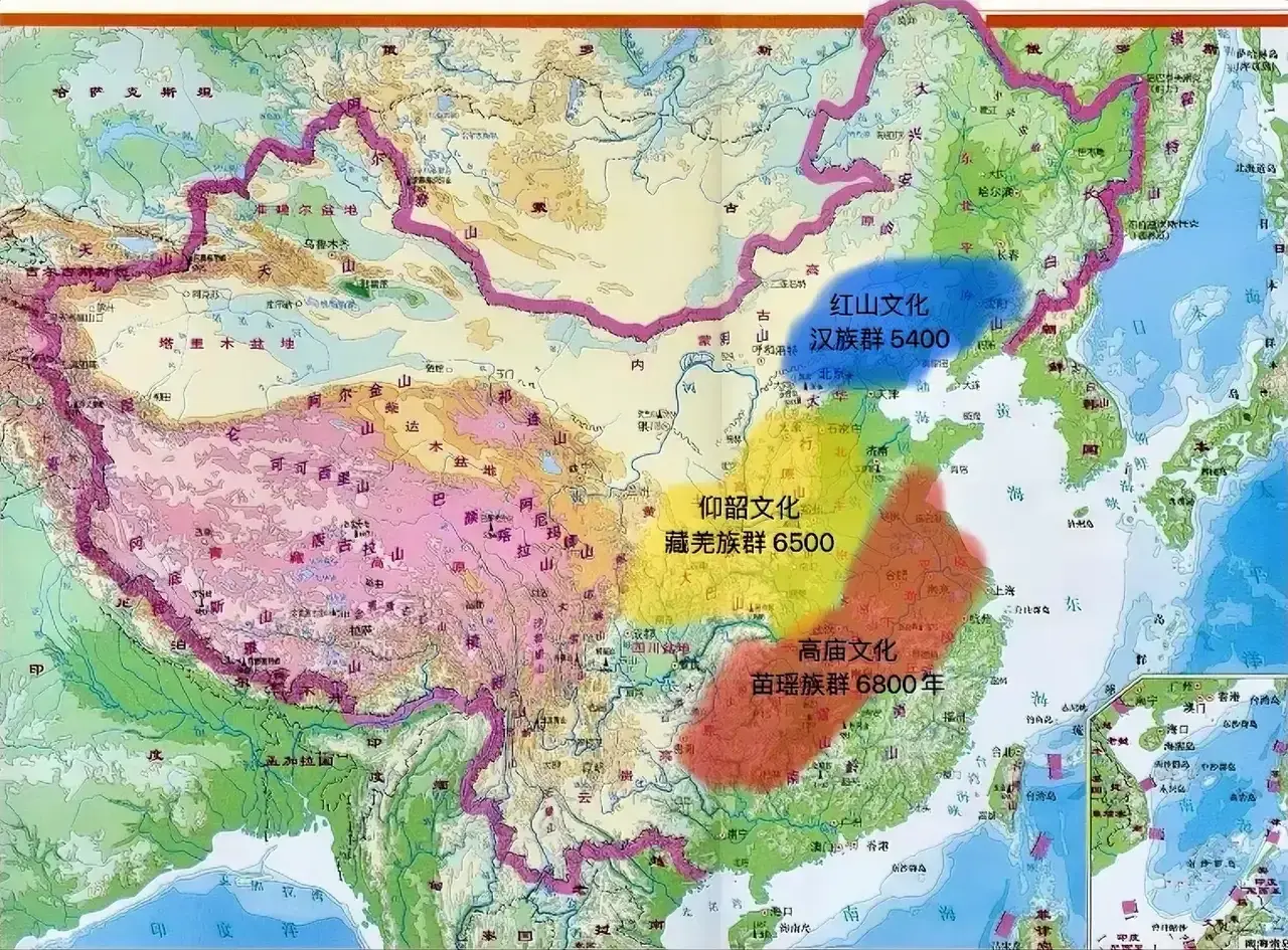 图21,中国三大文化族群分布图(红山文化/汉族群,仰韶文化/藏羌族群,高庙文化/苗瑶族群)
