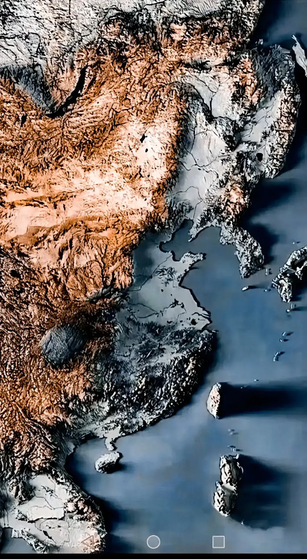 图5,卫星拍摄的中国东部地形图。四川盆地、华北平原、东北平原、贝加尔湖都能非常清晰的看出来。