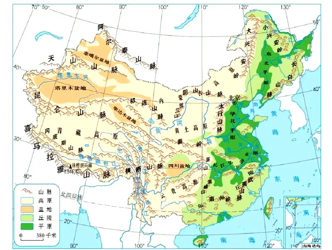 图15,中国地理研究所提供的地形图。可以很清晰分辨出第一阶梯(青藏高原)、第二阶梯(新疆地区、内蒙古高原、云贵高原、黄土高原)以及第三阶梯(长江中下游平原、华北平原、东北平原)的分界线。