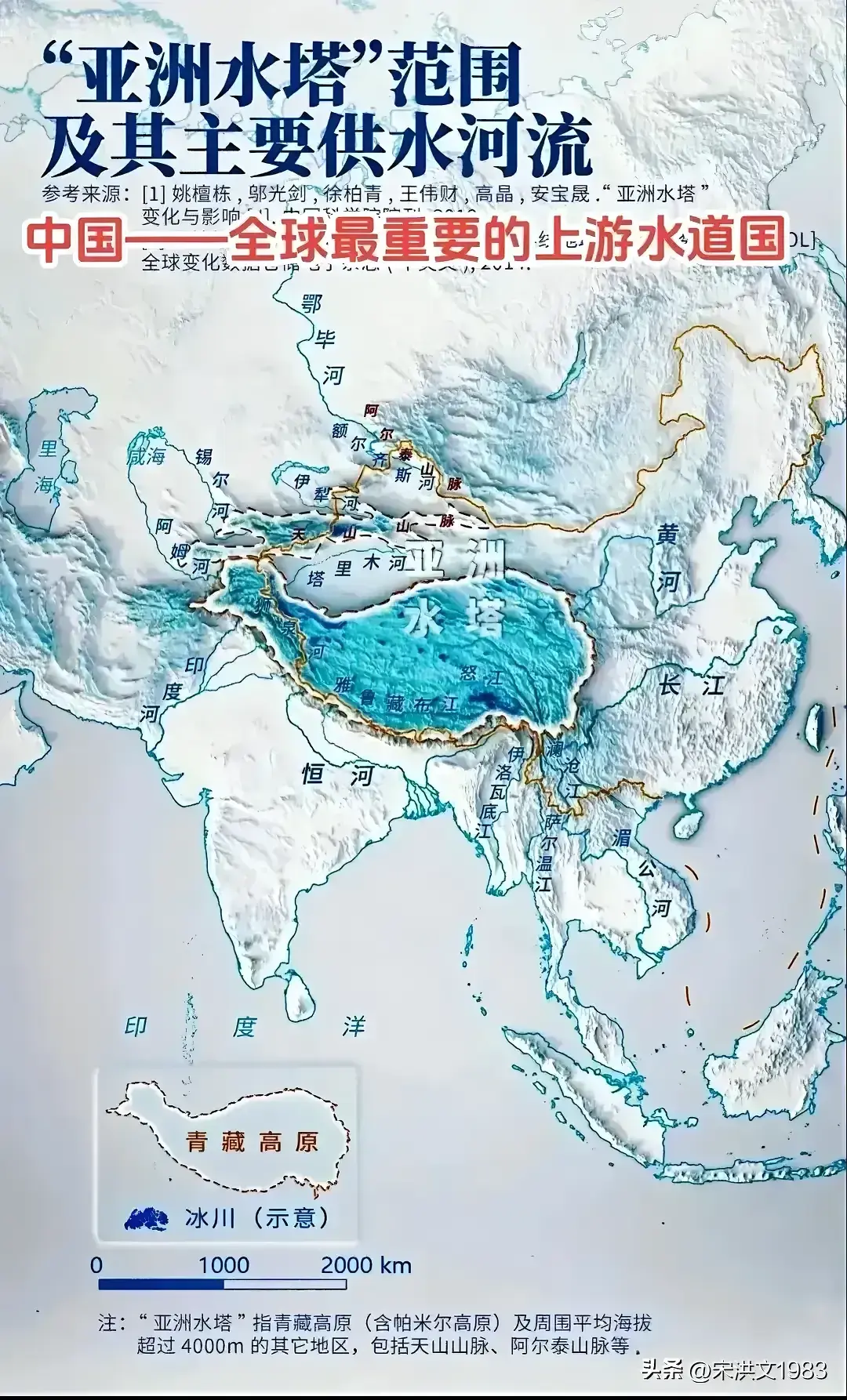 图13,“亚洲水塔”的范围及其主要供水河流示意图。我国的青藏高原是名副其实的“亚洲水塔”。