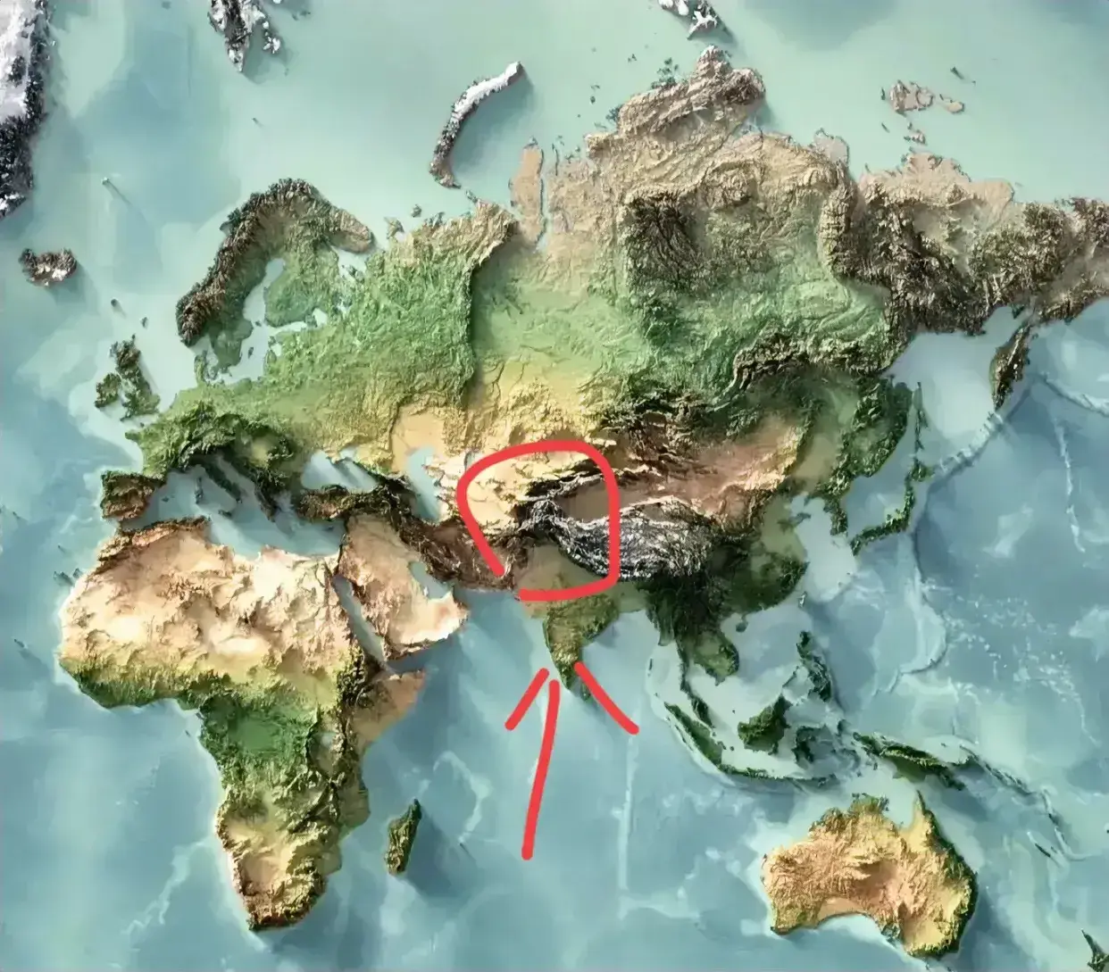 图14,以青藏高原为第一视角观察印度北部,中国以及周围的地形。