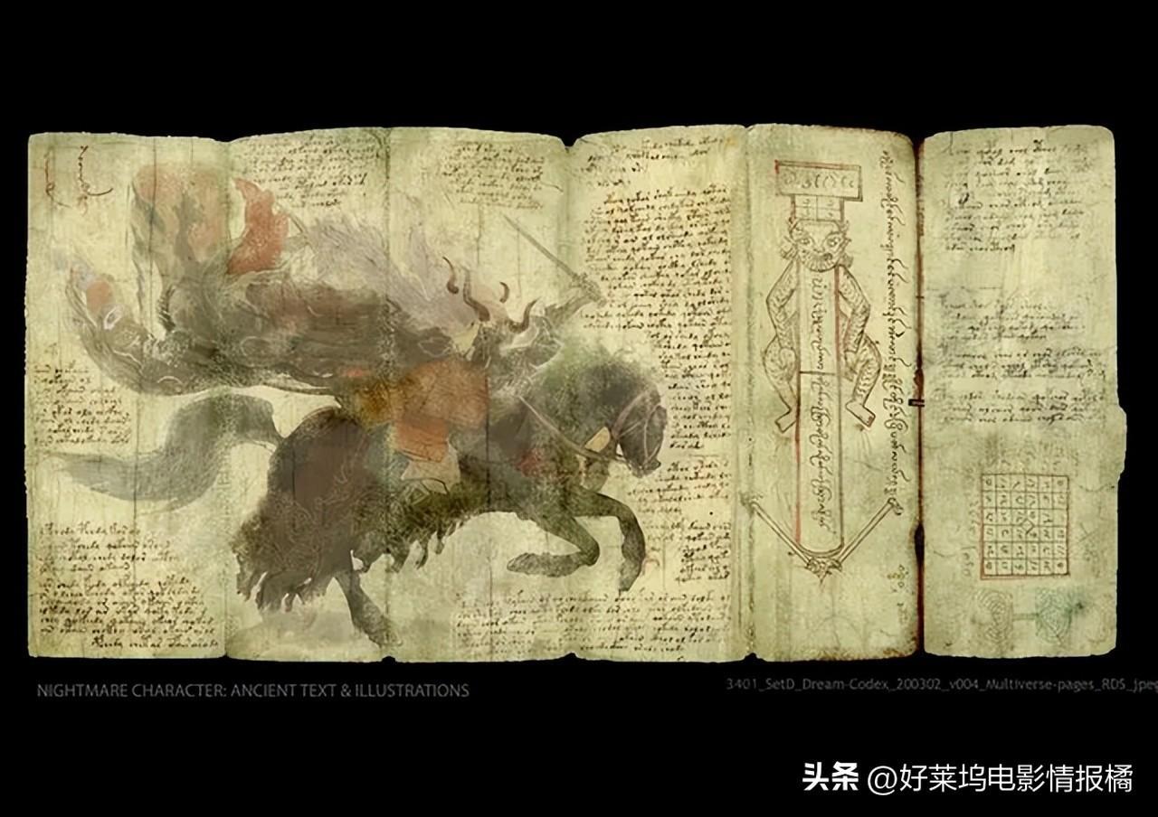 在一同曝光的电影片场布景设计,展示了一个冰冻的湖泊,大概和斯特兰奇的妹妹唐娜·斯特兰奇淹死的湖一样,甚至,在概念场景中,还展现了斯特兰奇与梦魇对峙的场景,这一幕中梦魇骑着马,穿戴和黑暗骑士类似的战甲。