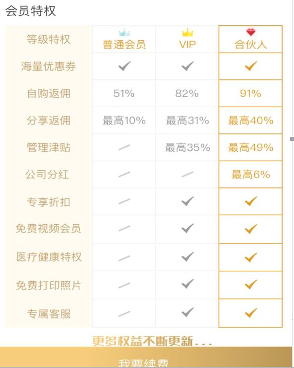 你的团队中至少要有20个VIP(必要条件),然后才能在会员中心购买升级!一个月198元!不仅自购可拿到91%的自购佣金,还有40%的团队佣金,49%的管理津贴,以及6%的公司分红!!!!且合伙人无等级限制!无限级!!
