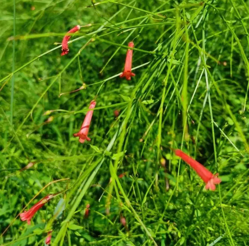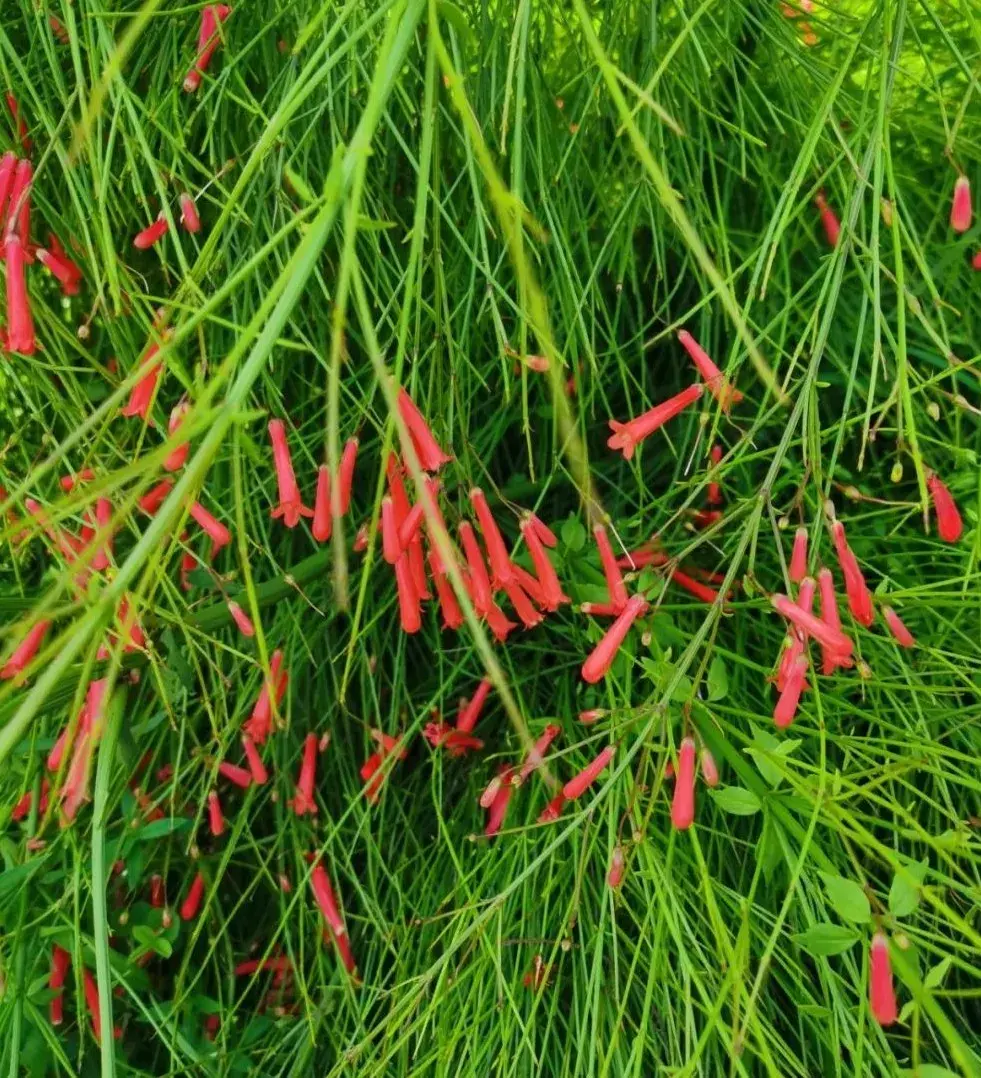 爆仗竹,又称爆竹花、鞭炮花、爆炸花、吉祥草、马鬃花、花丁子、观音柳、马骔花、珊瑚花、炮竹花等,为玄参科、爆竹花属。它原产于中美洲,在我国广东、福建等地有栽培。一般株高40到100cm,枝条纤细、绿色,最具特色的是它的花,红色长筒状,像爆仗,所以得名。一般5-11月开花。