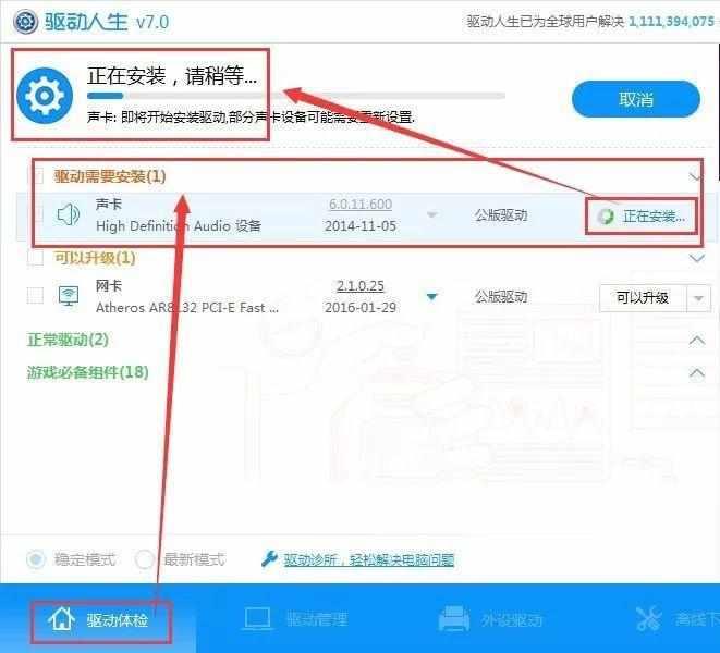通过驱动人生7查看是否有未安装的声卡驱动或安装声卡驱动