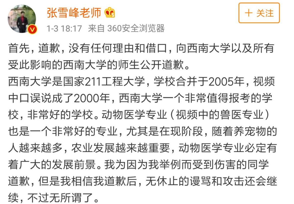 这不是第一次张雪峰的语言失误了。他在讲座中调侃西南大学兽医专业,惹得西南学子众怒,认为他侮辱母校,纷纷在网上讨伐他。最后张雪峰不得不张贴道歉信,平息事态。