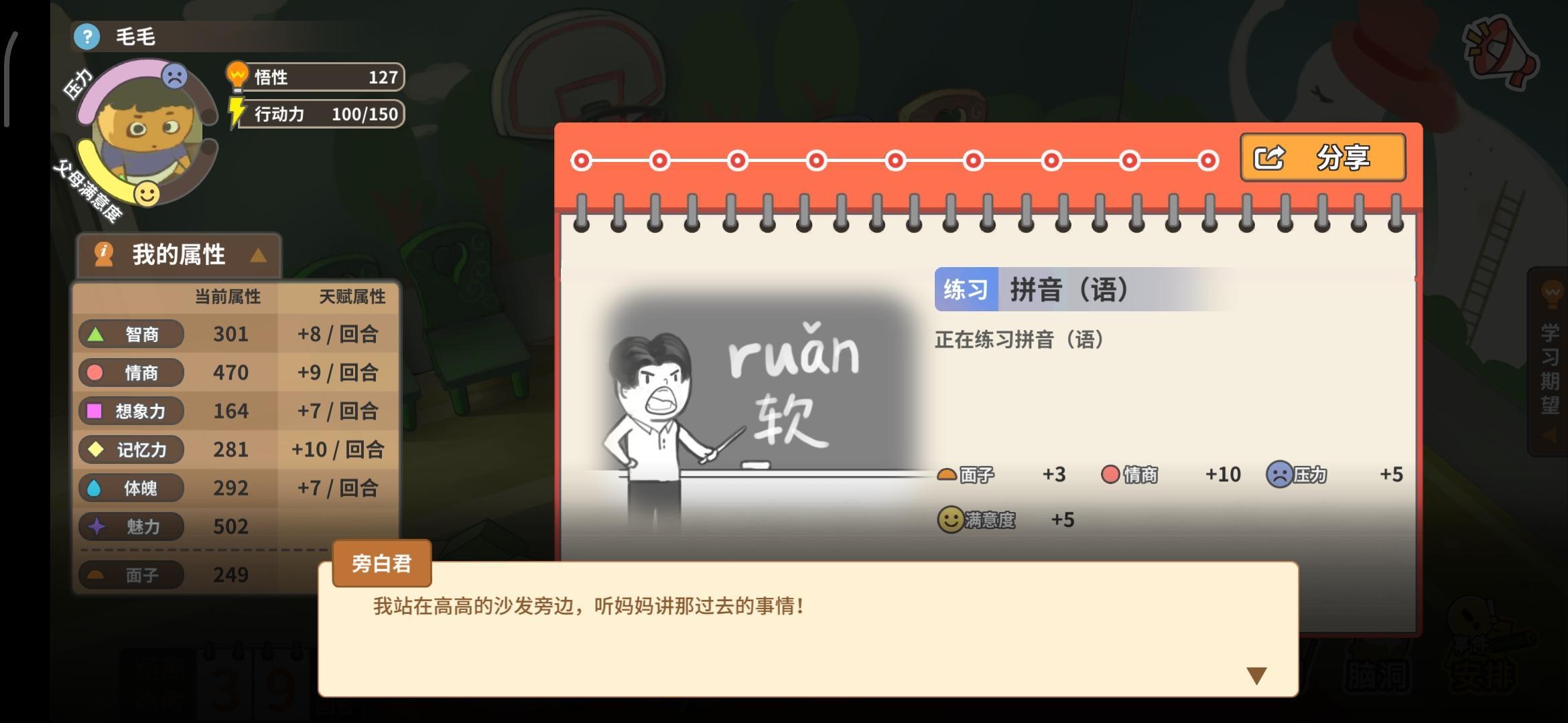 也许我们觉得自己小时候没有好好学习太后悔了,现在就想点亮自己身上十项全能的技能,每一份每一秒都不舍得浪费,每天高喊“我爱学习,学习是我的命”。因此在第一次玩这款游戏时,皮皮君拼了命的获得属性。