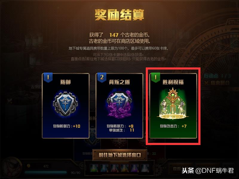 当然有些运气不好的小伙伴从开头到结束都没有拿到胜利之剑的也不用当心,蜗牛君给你准备了替代品,那就是胜利祝福,这张卡片可以给我们加攻击,如果前期遇到,手中没有胜利之剑的情况下是可以拿一张的,蜗牛君不推荐拿两张,第一,以后是需要换下来的,所以那多了更麻烦,其次加两次攻击然后再使用群攻卡片并没有加一张攻击然后使用群攻靠骗的伤害高,所以只推荐大家拿一张。
