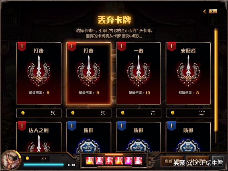 看到这里大家应该明白蜗牛君前面建议大家多走一些商店的用意了吧,没错,就是为了丢弃卡牌,因为初始卡片能用的比较少,我们走休息区区强化比较浪费金币,不如把一些没用的卡片丢弃掉,蜗牛君建议先丢弃一张加9防御的卡片,然后再丢弃单体攻击的卡片,在打怪过程中大家一定能获取1个行动点的群攻卡片,我们可以适当选取2张左右用来前期补输出,可以适当的进行升级,之后我们再扔掉防御卡片,此时基本上我们手里至少有1-2张胜利之剑了。