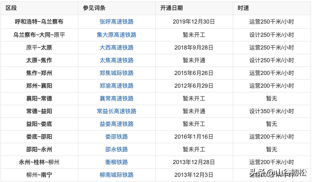 接下来是两条由自治区始发的两条重要干线:呼南高铁、包西高铁。呼南高铁由呼和浩特出发,终到广西南宁。呼南高铁贯通我国南北,由多段高铁线路组成,各段的具体情况如下: