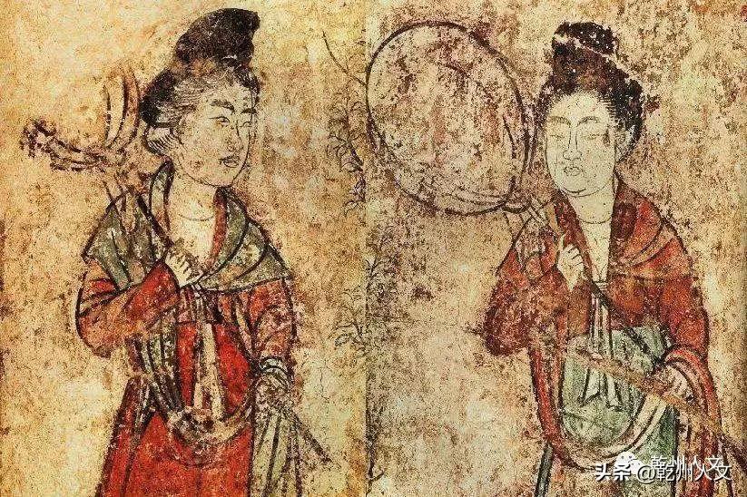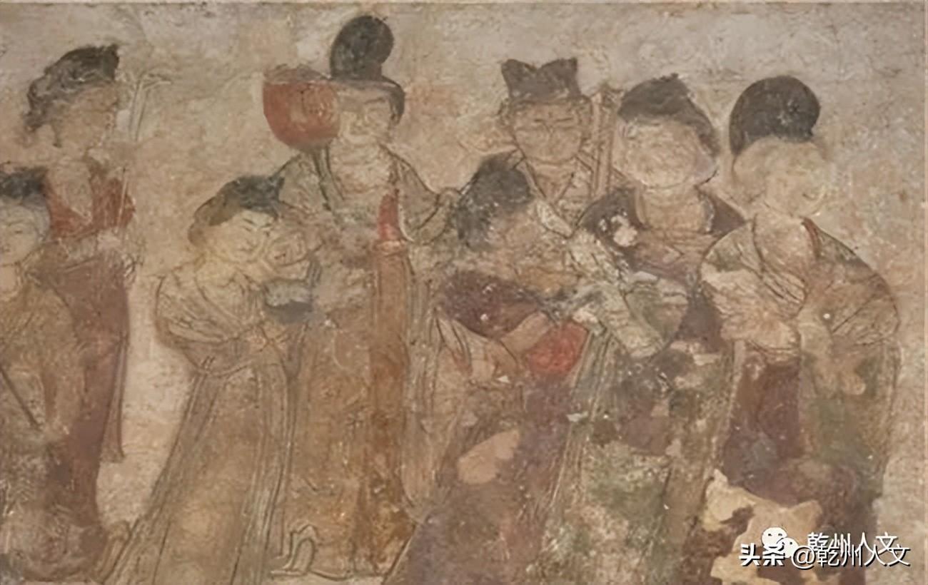 西壁南铺侍女亦七人一组,面部丰满圆润,体态清挺优美,多高髻或双髻,均着窄紧长袖,肩披彩帛,长裙曳地,下露云头履,手持瓶、杯、烛台、拂尘等各种物品,衣饰着色艳丽明爽,唯手、脸、衣服等多处因淤泥浸蚀剥落受损,不如上述第三过洞东、西壁男侍人物为完整。前面领头者四周布局稍见空松,随从略为密集,显其疏密之致,并有正侧面的变化,艺术水平不在永泰公主墓中的《女侍图》之下。
