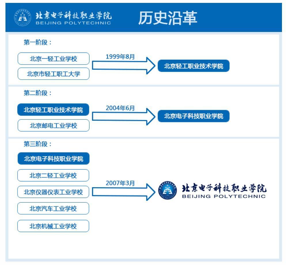 北京电子科技职业学院办学历史可追溯到1958年,1999年成为国家首批独立设置的高职学院,2004年,北京轻工职业技术学院、北京邮电工业学校合并组建北京电子科技职业学院。
