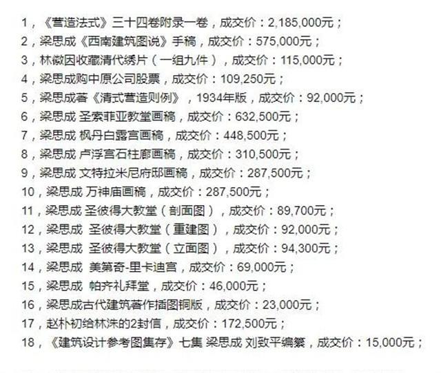 林洙拍卖林、梁遗物一览表