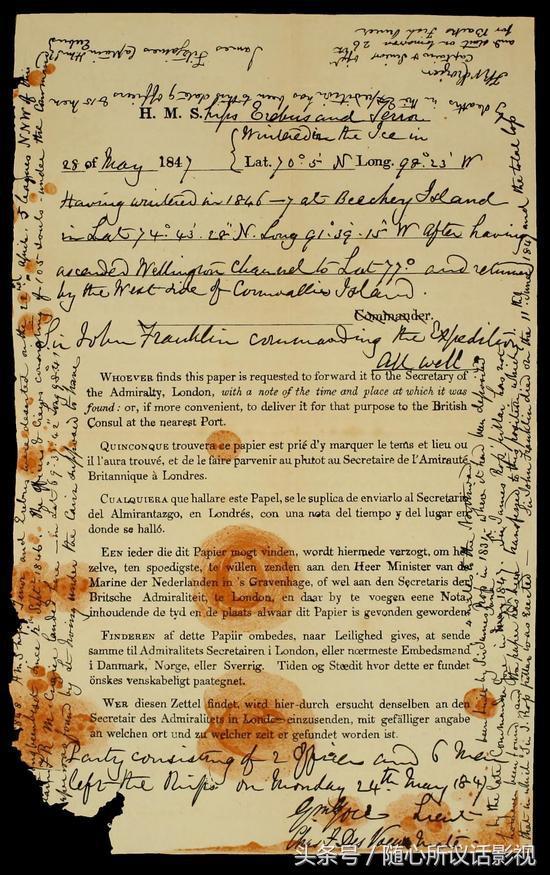 同年:富兰克林夫人要求海军部寻其夫下落。由于探险队带了足够3年的补给品出发,所以海军部在次年才派出搜索队和2万镑赏金开始搜寻。赏金和富兰克林的失踪吸引了大众关注,最高峰时曾有10艘英国船及2艘美国船向北极出发。