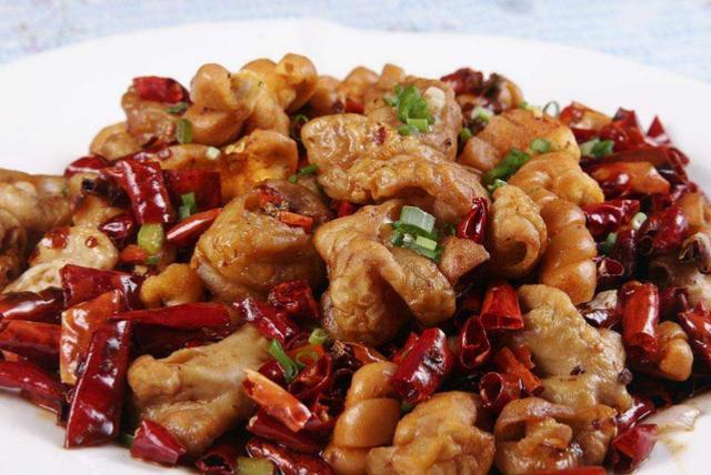 4.净锅下油烧热,下浸辣椒煸香,再放入肥肠,调味翻匀即可。