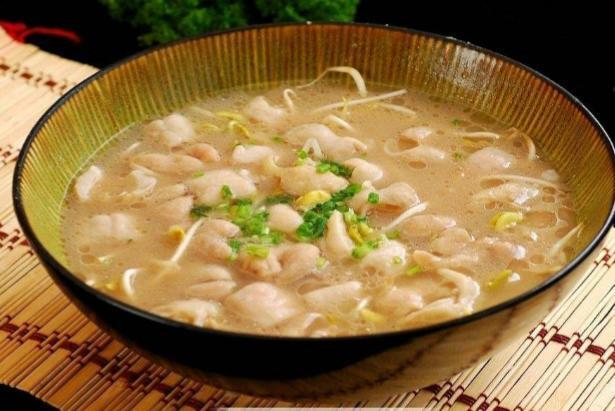 3.另起锅加入高汤,加入牛肉粉,胡椒粉,藤椒鸡汁,盐,味精,鸡粉,鸡汁烧开,加入鱼片,大肠小火烧两分钟出锅,装入碗内