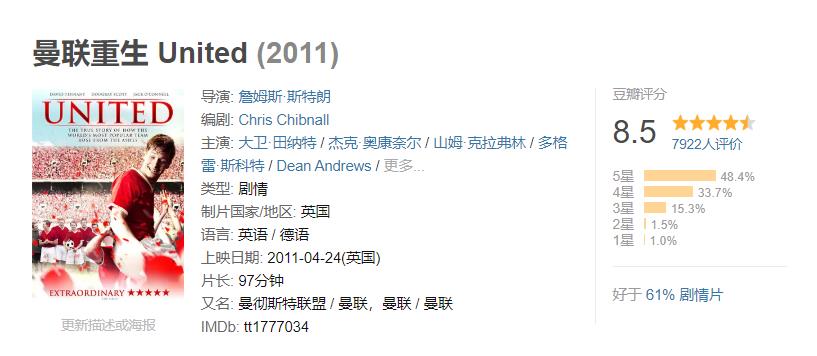 1. 《曼联重生》豆瓣评分:8.5分