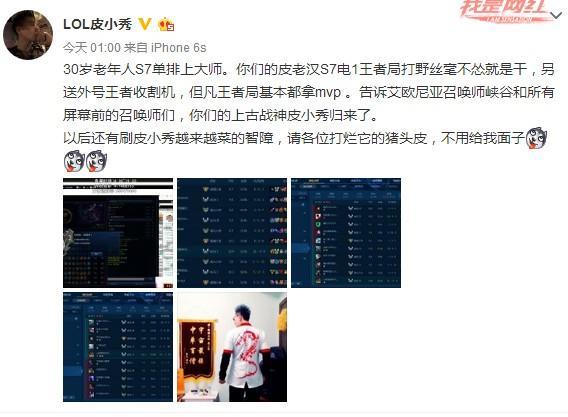 最近小秀都在熊猫直播,中单盲僧出金身,这就是他自己对于盲僧这个英雄的理解,而且老汉现在开始走娱乐风了,Cosplay也是玩的贼溜,龙瞎,地下拳王也是扮的像模像样。皮老汉最近也发博(30岁老年人S7单排上大师。你们的皮老汉S7电1王者局打野丝毫不怂就是干,另送外号王者收割机,但凡王者局基本都拿mvp 。告诉艾欧尼亚召唤师峡谷和所有屏幕前的召唤师们,你们的上古战神皮小秀归来了。)