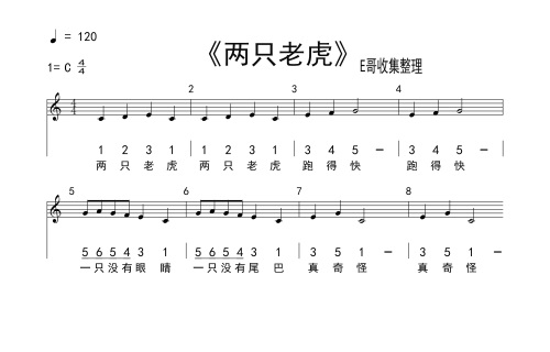 四、《两只老虎》五线谱加简谱歌词单音旋律版本