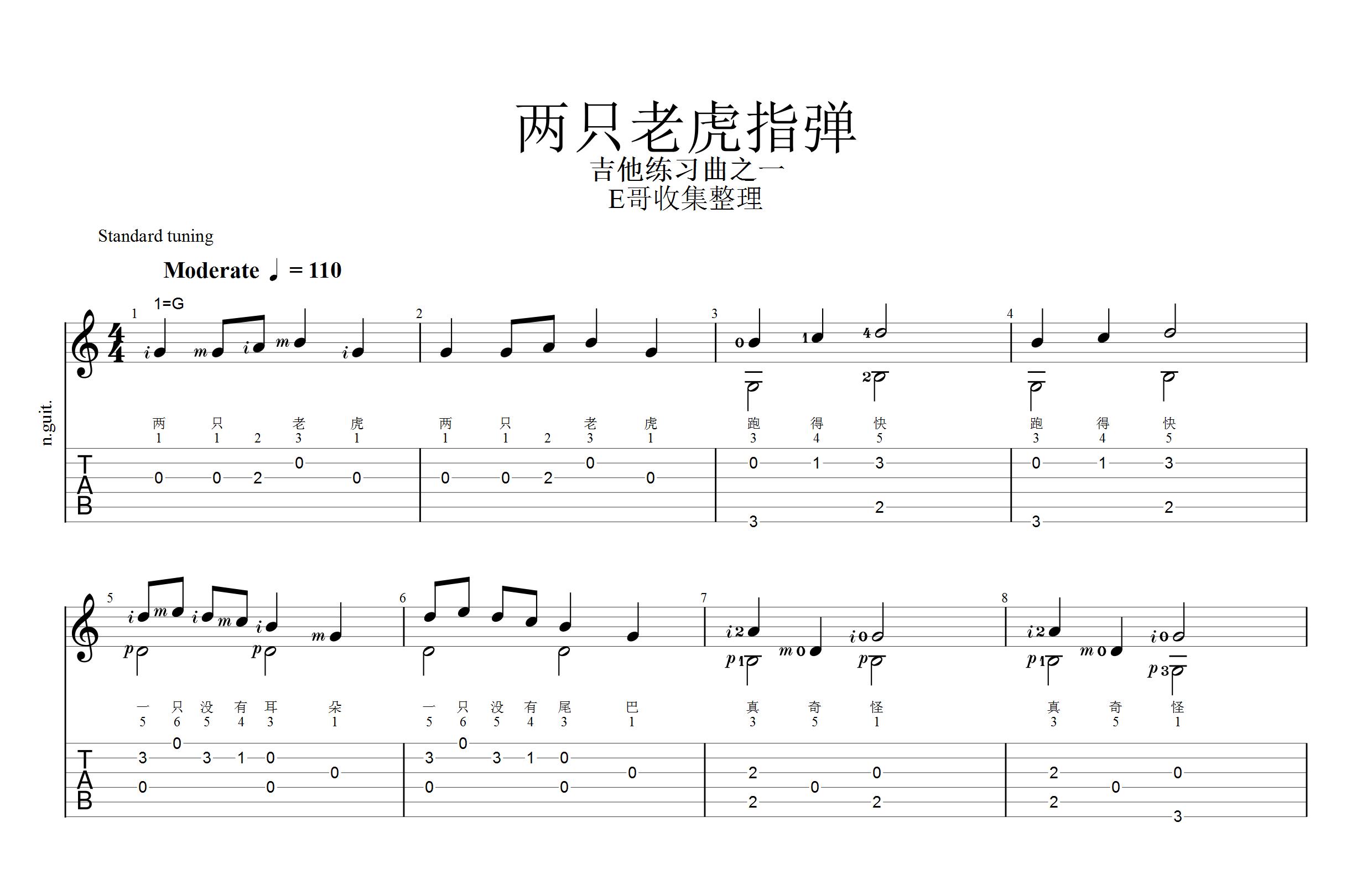 三、《两只老虎》吉他指弹六线谱加五线谱