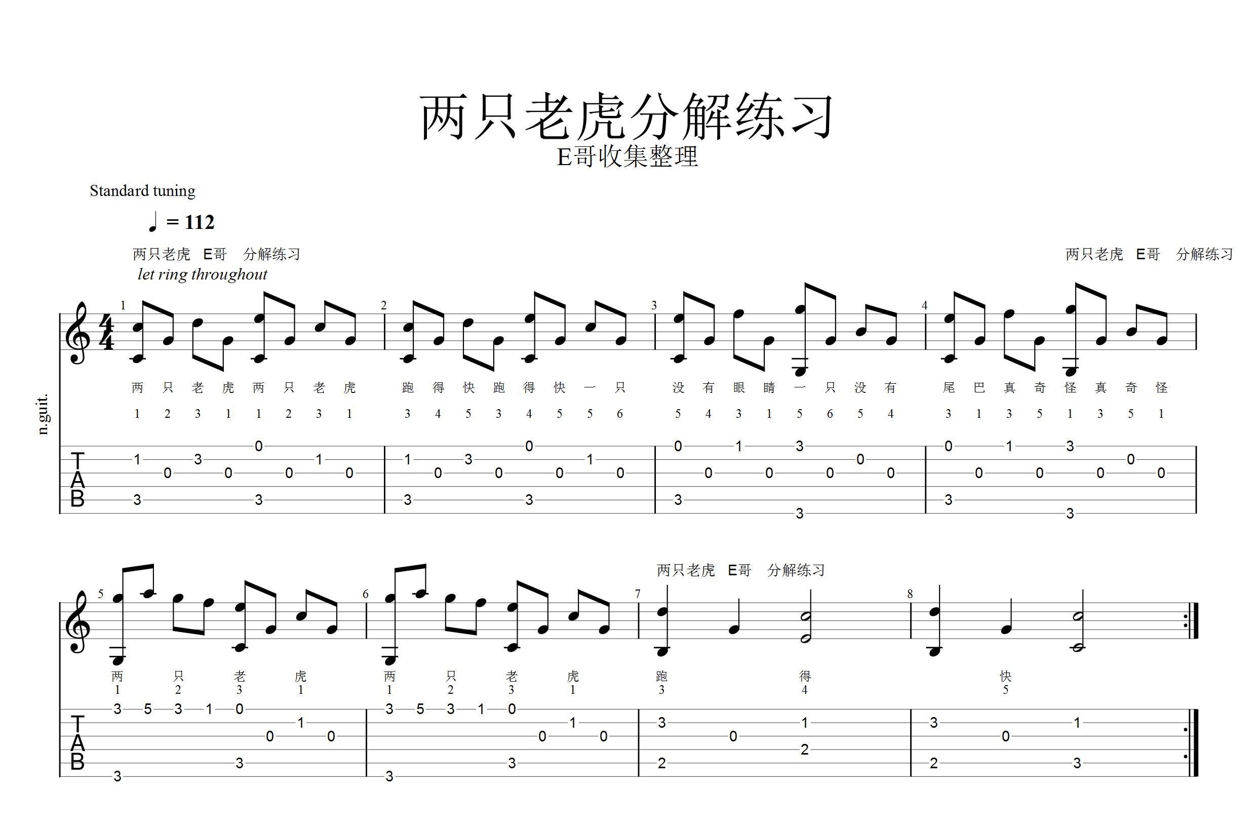 二、《两只老虎》吉他分解弹奏五线谱加六线谱