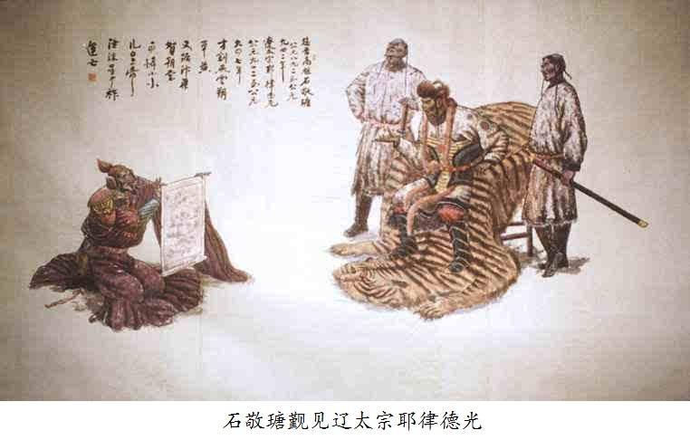 石敬瑭朴实稳重,寡于言笑。喜读兵书,重视李牧、周亚夫行事,隶属于后唐明宗李嗣源帐下,迎娶唐明宗李嗣源之女。参与后梁朱温与晋国李克用、李存勖"梁晋争霸",冲锋陷阵,战功卓著。明宗先后以敬瑭为保义、宣武、天雄、河阳、河东节度使。闵帝即位,加敬瑭中书令。不久闵帝被杀,后唐末帝李从珂即位后,拜为河东节度使,封为赵国公,赐号"扶天启运中正功臣",然而君臣相互猜忌,敬瑭遂与桑维翰、刘知远谋反。末帝下诏讨敬瑭。敬瑭以割地、称臣、称儿为条件,求契丹出兵相助。十一月,契丹主耶律德光立敬瑭为帝,国号晋,史称后晋。改元天福。后晋割幽蓟十六州给契丹,并每年献帛三十万匹。从此河北大平原无险可守。天福二年(公元937年),敬瑭迁都汴州。三年,升汴州为东京,置开封府,改洛阳为西京。他谄事契丹贵族,凡遇吉凶庆吊,都额外进奉金玉珍玩,契丹太后、太子、贵族、大臣,都有礼品赠送。敬瑭在位七年,连年发生兵乱。天福七年,吐谷浑部不愿降契丹,附于河东,契丹主因此责问敬瑭,敬瑭忧郁成疾而死。