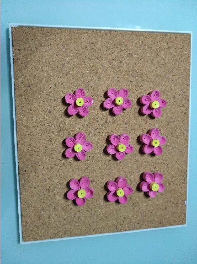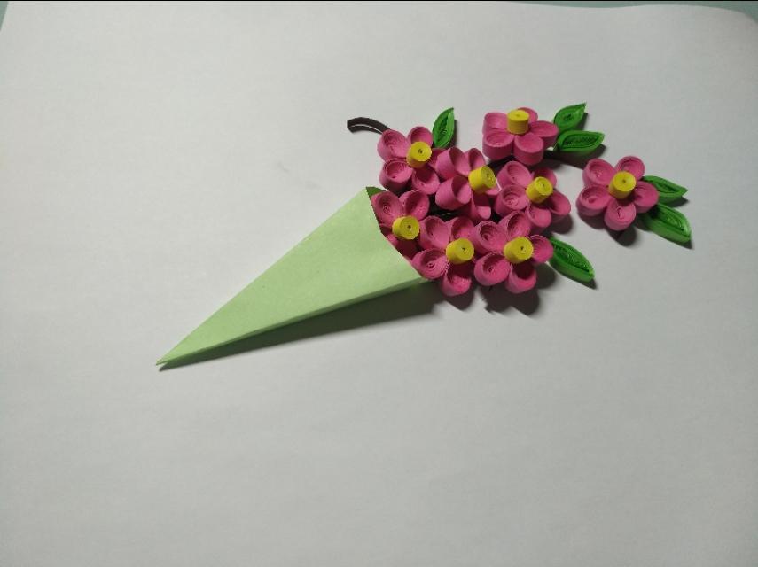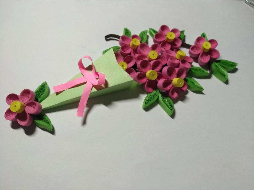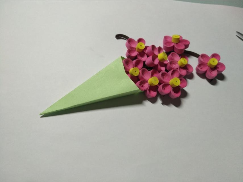 54厘米粉红色衍纸条,用衍纸笔卷成紧卷。一共卷54个,每5个花瓣做一朵花,用白乳胶粘好,27厘米的黄色衍纸条卷花蕊。