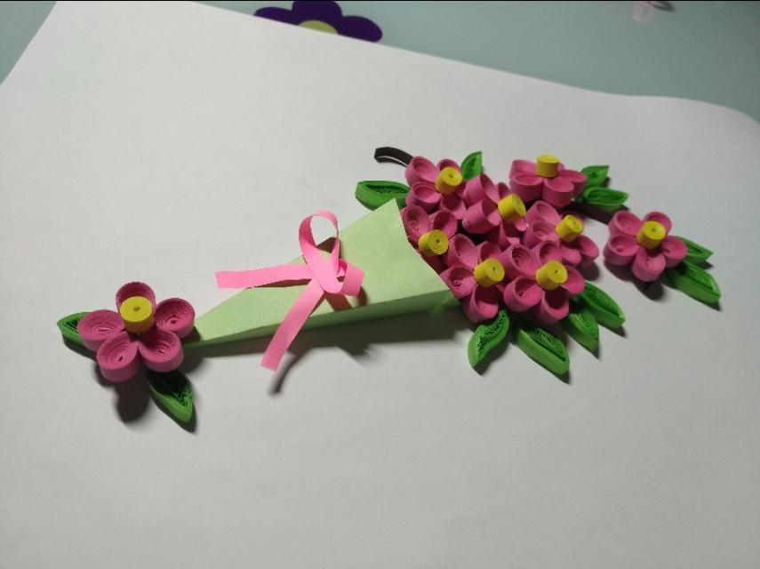 用粉色衍纸条做一个蝴蝶结,放上去。