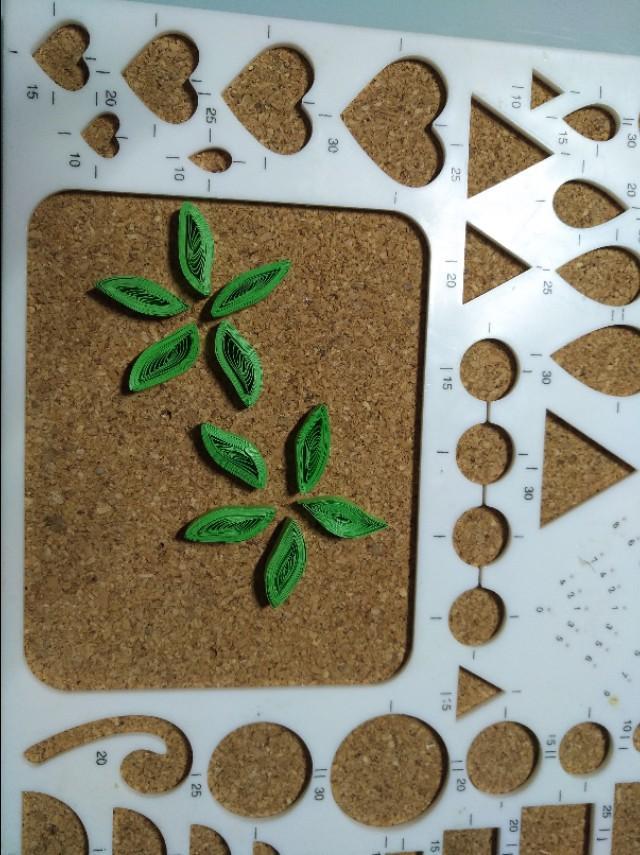 54厘米绿色衍纸条,卷好放衍纸板15号孔里捏成柳叶状,一共做9个。