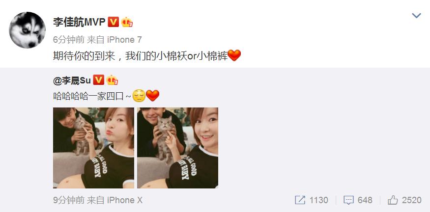 12月21日,李晟在微博晒孕肚宣布怀孕的好消息,李佳航抱着小猫咪出镜并俏皮地称之为“一家四口”,随后李佳航转发回应:“期待你的到来,我们的小棉袄or小棉裤”。
