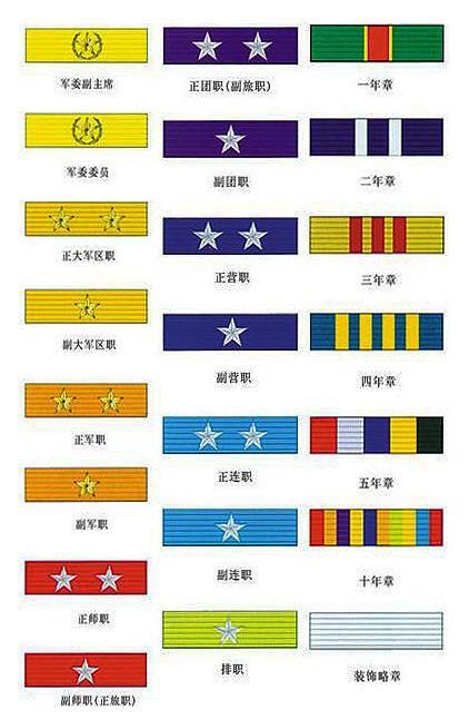 我国07式军服上也有这种彩条,不过与外军是有区别的,07式军服佩戴的不是勋略表,它叫资历章,只起到表明军龄的作用,一条竖杠表示一年,最上面正中一块有五角星的表明级别,两颗星为正职,一颗星为副职,颜色不同级别也不同。
