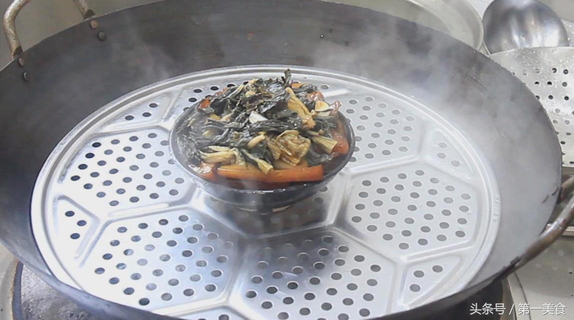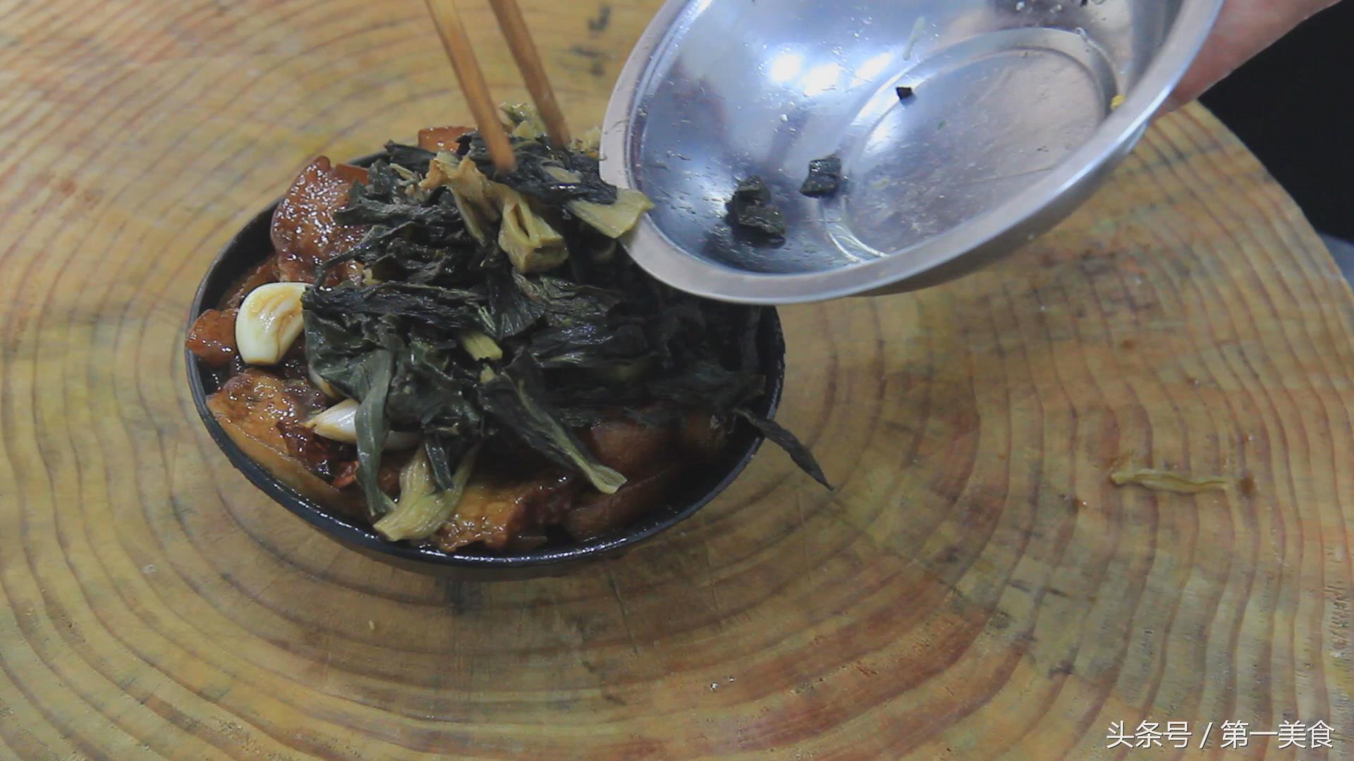把肉片像视频中那样整齐的地码在扣碗里。把盆里的料汁倒在肉片上面,最后放入切好的梅菜。
