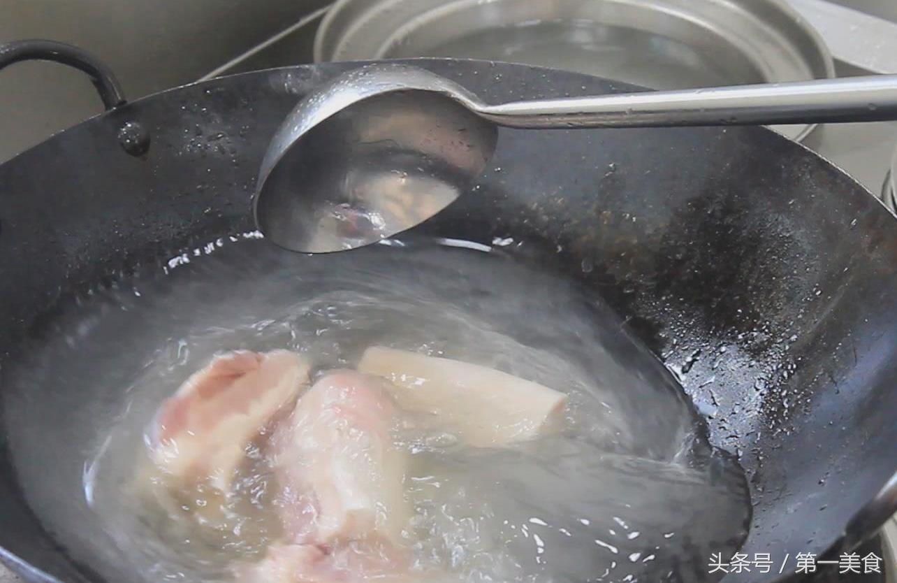 把五花肉用水煮一下,锅内烧水,凉水下入五花肉块。