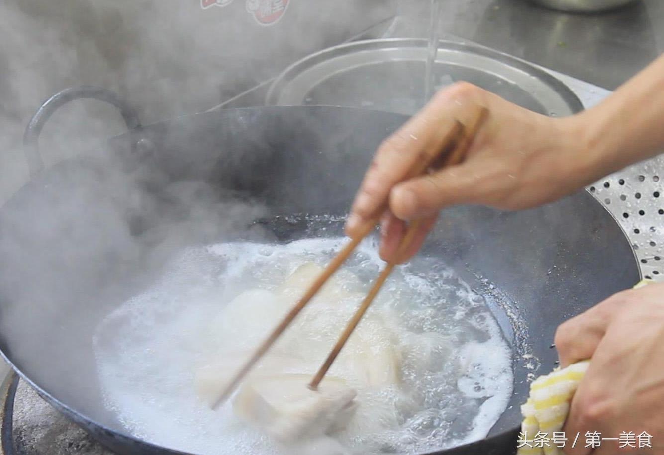 大约八成熟时,就要捞出,用凉水冲洗快速冲凉,用凉水冲洗肉块,肉块在后面的炸制中不容易溅油。