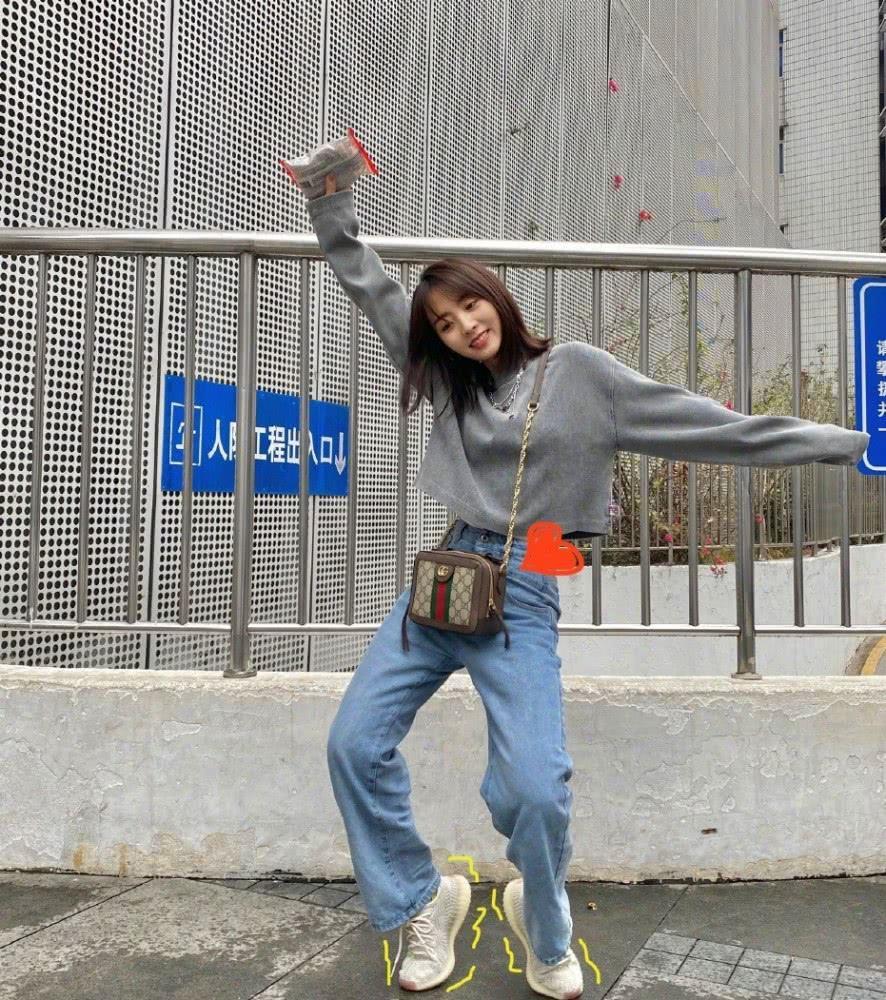 而及肩发则有另外一种活泼、元气感,很显高。一件短款的灰色长袖卫衣,下身搭配高腰的浅色牛仔阔腿裤,高腰设计瞬间就显高了不少。看起来休闲而又活力。