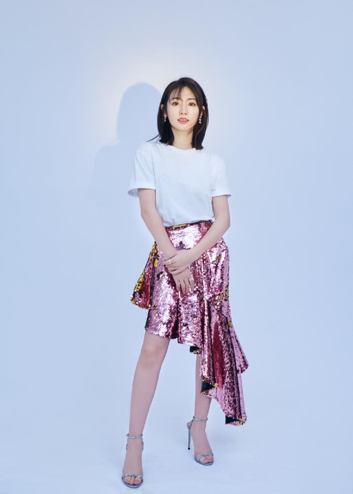利落清爽的小短发,既衬肤色白皙,也衬模样娇俏。她的上身是一件简约的白色T恤,下身则是粉紫色的亮片不规则半身裙,尤其是一双美腿,笔直、纤细,搭配一双银色细跟高跟鞋,非常吸睛。