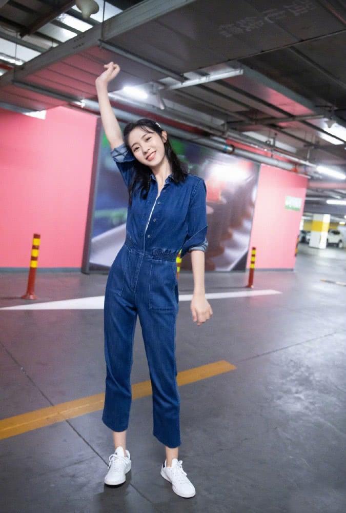 或是脸上挂着明媚的笑容,淡妆也丝毫掩饰不住的邢菲的美貌。她穿着一袭干练利落的牛仔连体裤,九分裤露出一截纤细的脚踝。她脚踩一双白色运动鞋,单手向上举高,看起来显高而又元气满满。