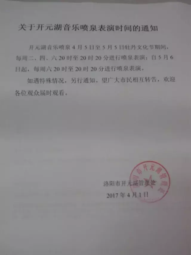 开元湖音乐喷泉4月5日至5月5日牡丹文化节期间,每周二、四、六、20时20分进行喷泉表演:自5月6日起,每周六20时至20时20分进行喷泉表演。