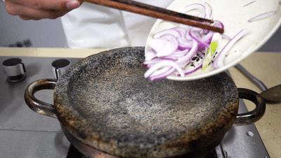 4.将石锅加热后放入洋葱片、胡萝卜片、辣椒片垫底在放上鸡块加热