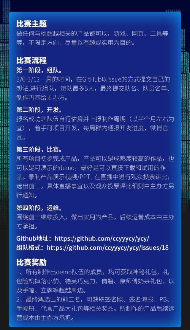 编程大赛的主题是与杨超越相关的任何游戏、网页、工具等。参与者需在GitHub上以issue的方式提交想法并组队,每队最多 5 人。届时将会把每队的项目产品演示视频或PPT在直播中展示给观众并进行投票评比。获胜的前三名将由主办发承担后期运营成本,继续开发并推出产品。