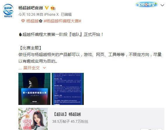 论追星,这大概是我见过最硬核的。据微博大V@圈内少友爆料,近日,百度贴吧吧主一刀两断在杨超越吧为自己的爱豆组织了第一届杨超越杯编程大赛。报名时间从 3 月 6 日到 3 月 12 日。