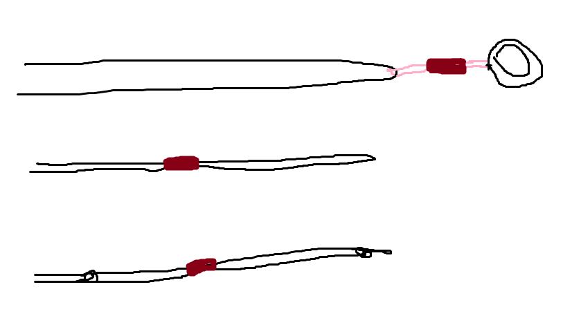 如图可做成竿梢活套,主线在打结时,先穿个太空豆,然后在太空豆两边各打一个结。在跟鱼竿连接时,做一个活套套鱼竿上,推上太空豆固定。