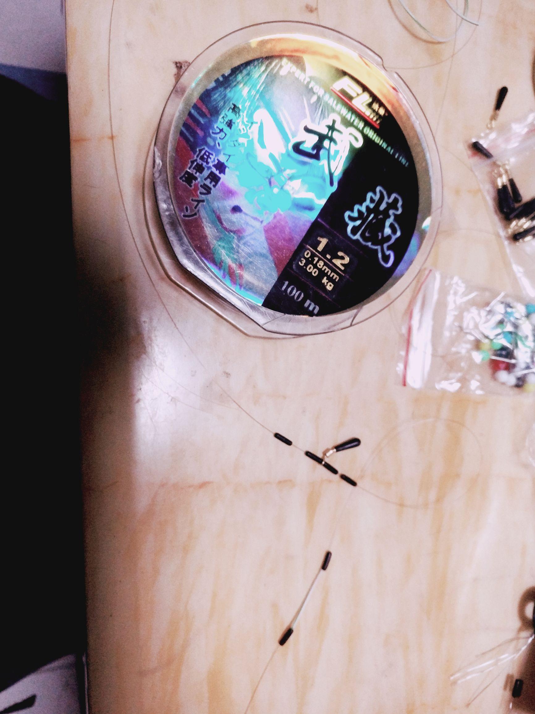 首先取出鱼线和太空豆,按顺序串上两个太空豆、浮票座、再三个太空豆,铅皮座、再一个太空豆,八字环。根据需要的长度,剪好鱼线,在另一头串上太空豆,双线,打结。